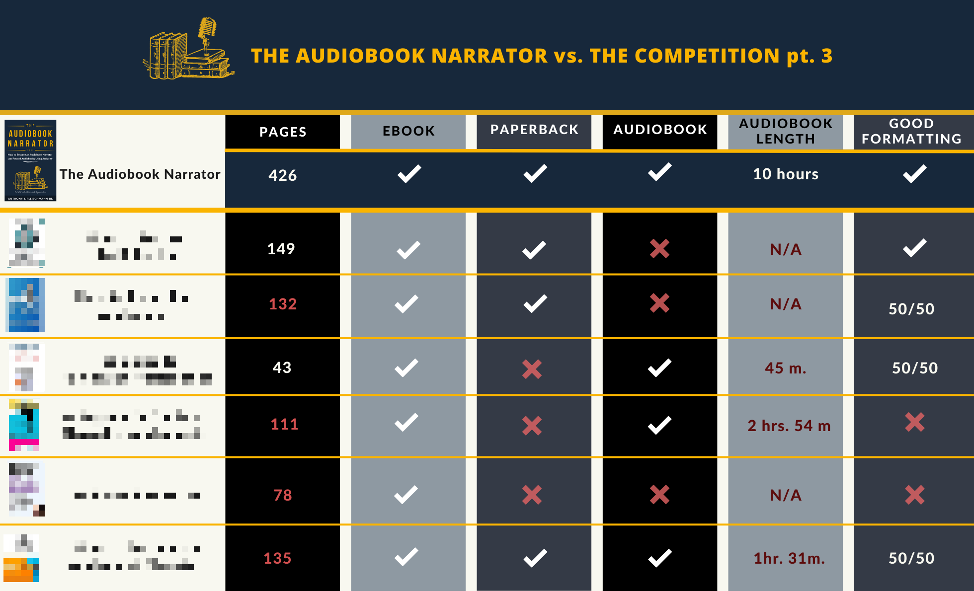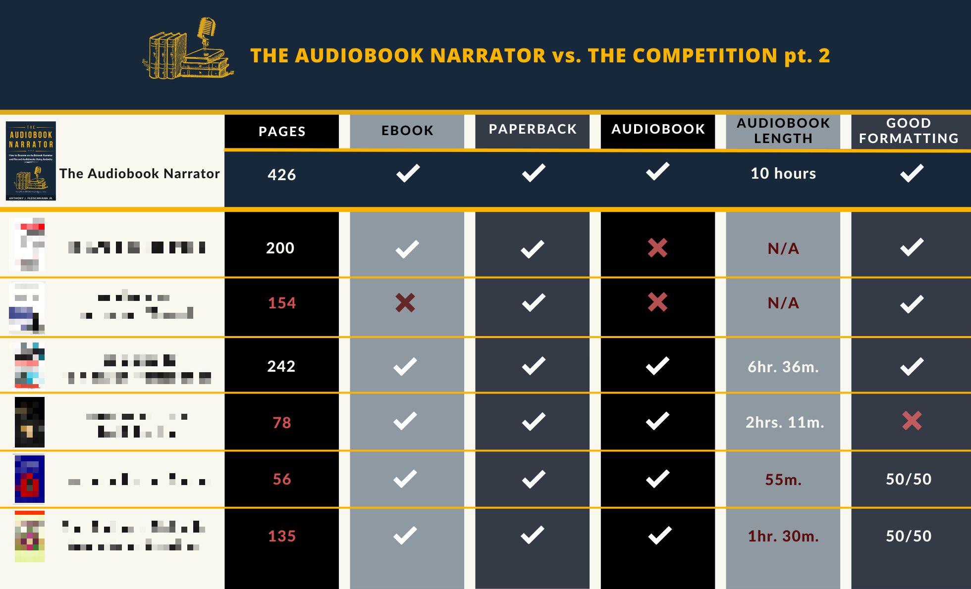 The books listed are some of the more popular books that come up when searching for books on the topic of Audiobook Narration. As you can clearly see, there are only two books that are over 200 pages and most don't even have an Audiobook Narrated. That's just crazy to have a book on the topic of Audiobook Narration, but not have an actual Audiobook Narrated on the topic.