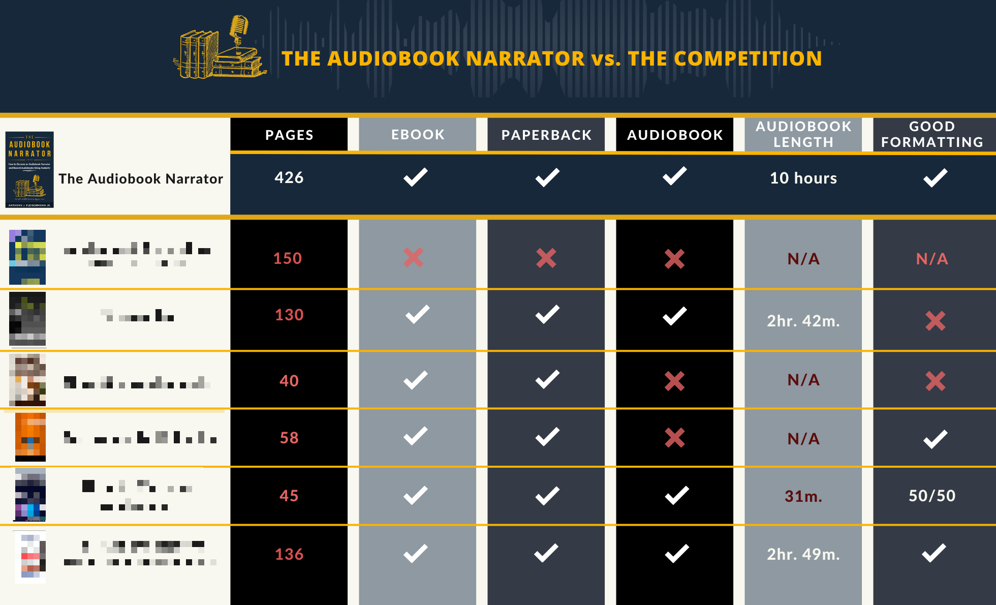 But out of respect for the Authors, and more importantly to avoid legal issues, I have blurred each of the covers and titles. One note about the book in the chart that is 6 hours and 36 minutes - This book does not teach you how to create Audiobooks, it's more of a legal guide to dealing with Audiobook Rights and Contracts.
